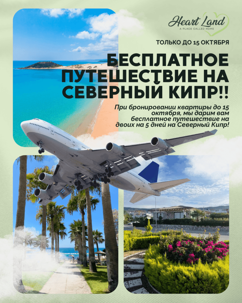 До 15 октября при бронировании любой квартиры вы получаете в подарок путешествие на двоих на Северный Кипр сроком на 5 дней.
